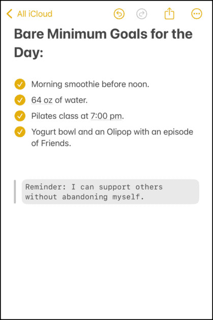 I’ve had plenty of days when my only goal was just to get to bedtime. I would set bare-minimum goals for the day and focus on just that. I shared a screenshot of my day below.